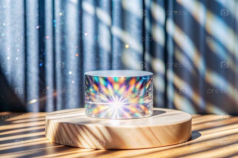 Пустой цилиндрический подиум со сверкающими кристаллами при преломлении света на минималистическом фоне, стенд для демонстрации моделей косметики и товаров