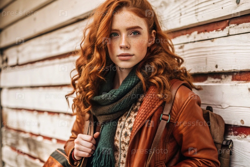 Осенний портрет. Близкий план молодой рыжеволосой женщины с выразительными зелеными глазами в коричневом кожаном куртке и бирюзовом шарфе