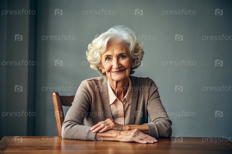 Минимализм.Студийный портрет стильной, элегантной пожилой женщины, 70-летнего пенсионера в интерьере и одежде спокойных тонов.Концепция пожилых людей