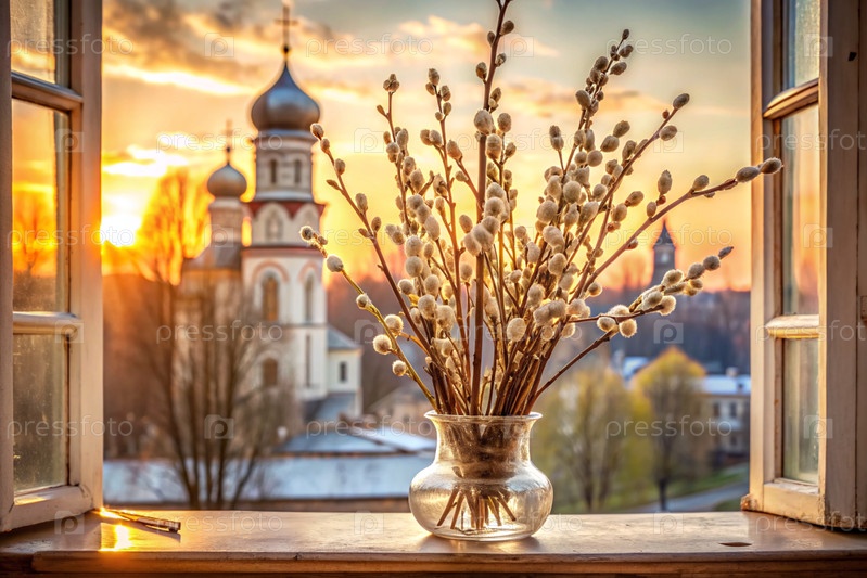 Большой план букета ивы в стеклянной вазе на фоне древнего белого окна с видом на золотые куполы храма и заходящее солнце
