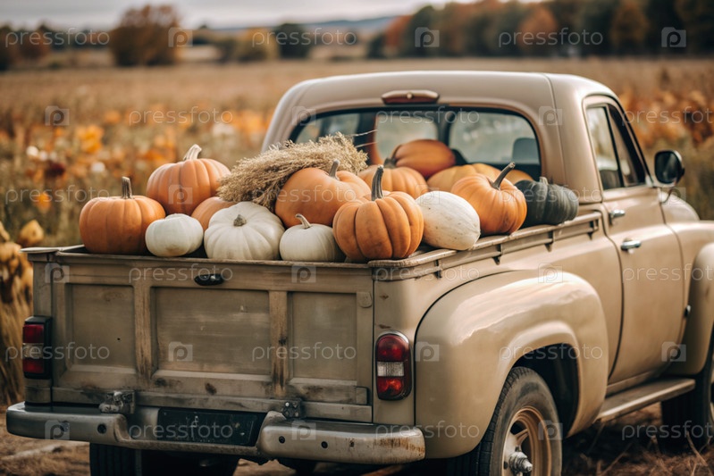 Осень, осенний дизайн.Большой урожай тыквы на заднем сиденье ретро-пикапа, крупный план