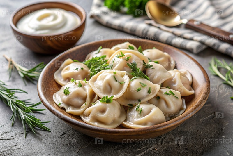 Русская кухня, пельмени в керамической миске с сметаной и травами