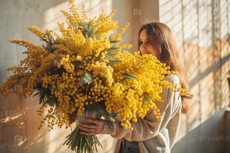 Красивая девушка с пушистым букетом мимозы. Близко Концепция весны и Международный женский день 8 марта
