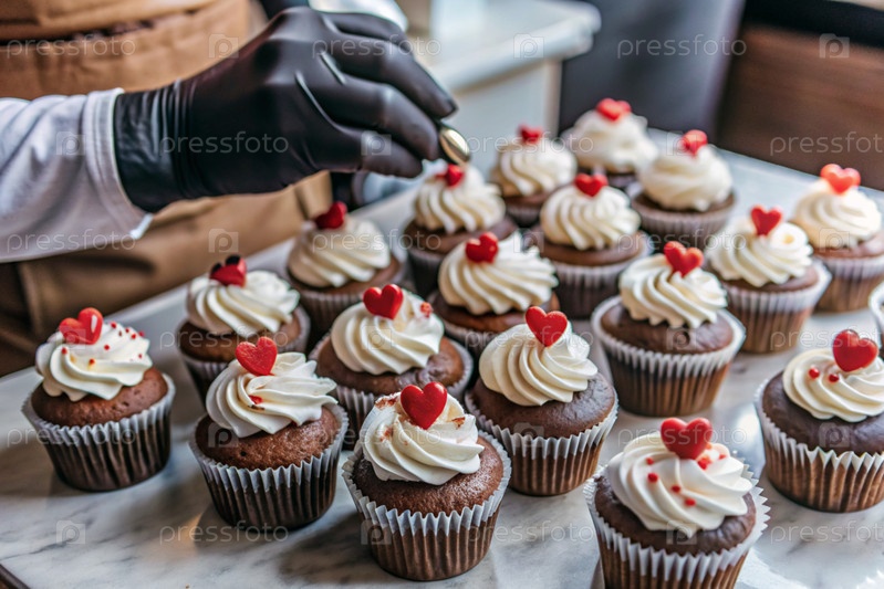 Профессиональный кондитер в черных перчатках украшает кексы сливочными и красными сердцами