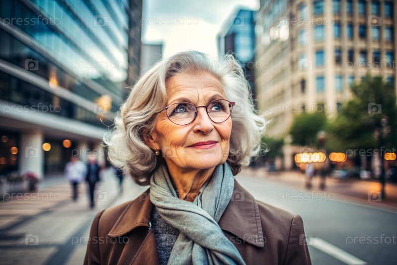 Портрет стильной, модной пожилой женщины, 70-летнего пенсионера на улице с очками и одеждой в спокойных бежевых тонах