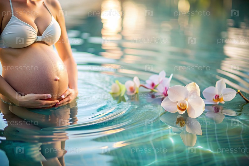 Расслабление, душевное спокойствие. Беременная красивая женщина в отопительном бассейне на открытом воздухе. Понятие беременности, родов и родительства. Здоровый образ жизни