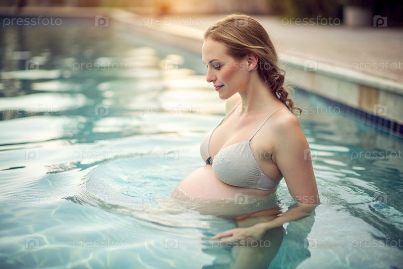 Расслабление, душевное спокойствие. Беременная красивая женщина в отопительном бассейне на открытом воздухе. Понятие беременности, родов и родительства. Здоровый образ жизни