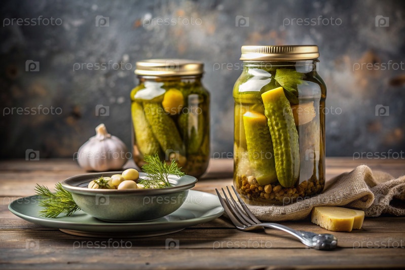 Хрустящие огурцы в прозрачной стеклянной банке на столе, покрытые льняным скатертьем. цельнозеленые маленькие огурчики с укропом и чесноком. вкусные овощи из консервов. мы закрываем огурцы для зимы