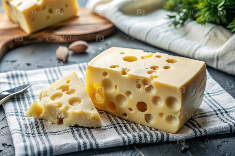 Сыр с Massadam отверстиями, кусок сыра на режущей доске