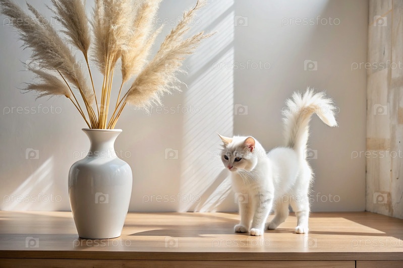 Животные в доме. Современный интерьер в скандинавском стиле. Белая керамическая ваза с сухой травой на деревянном столе и белый пушистый котенок
