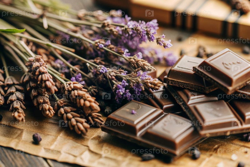 Кусочки шоколада с веточками лаванды для десерта на деревянном фоне