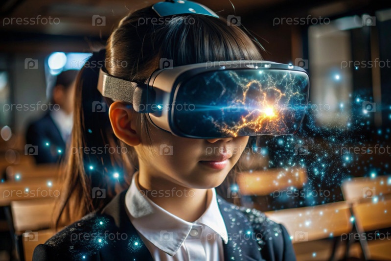 Азиатская девушка с очками виртуальной реальности.Ребенок находится в классе, а другие ученики на заднем плане.Цифровой интерфейс отображается в наушниках