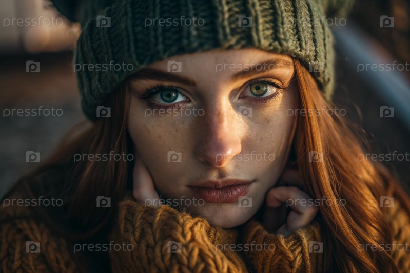Осенний портрет. Близкий план молодой рыжеволосой женщины с выразительными зелеными глазами в вязанной шляпе и свитере