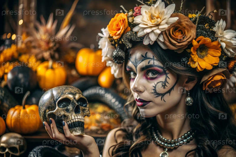 Концепция Хэллоуина. Ужасно. Костюмированная вечеринка. Красивая женщина с покрашенным черепом на лице и цветами на голове. Баннер, открытка