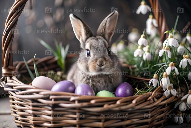 Баннер. пасхальный кролик в корзине из красочных пасхальных яиц вокруг весенних снегопадов и первичной розы. концепция праздника Пасхи