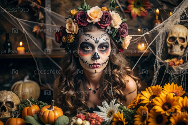 Концепция Хэллоуина. Ужасно. Костюмированная вечеринка. Красивая женщина с покрашенным черепом на лице и цветами на голове. Баннер, открытка