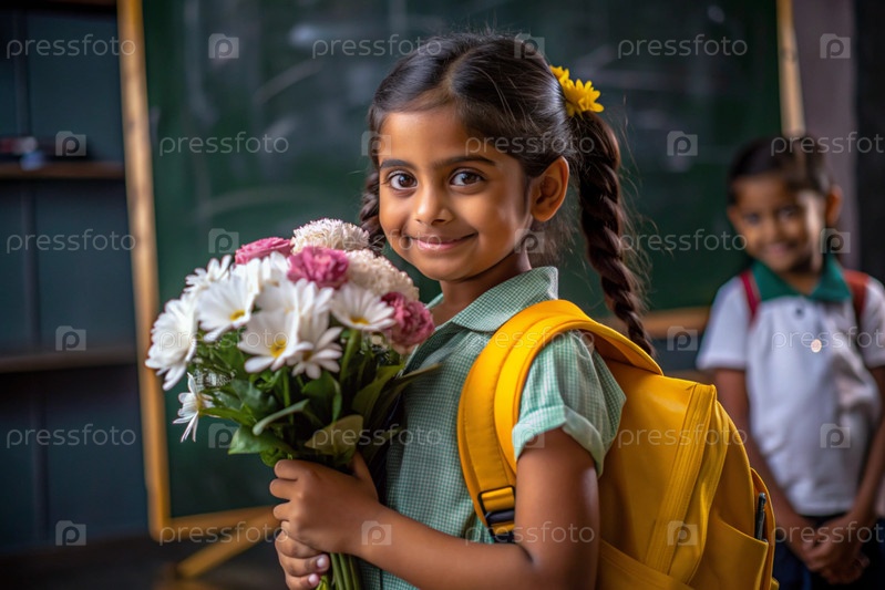 рыжеволосая скандинавская девочка со своими очками у доски. девушка держит цветы в руках. это ее первый раз, когда она ходит в школу. ребенок с рюкзаком, книгой и цветами. обратно в школу