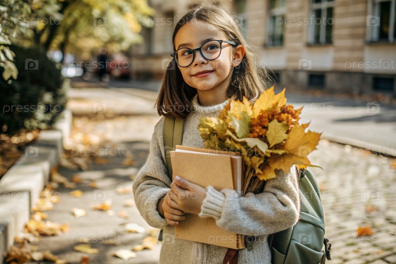 Красивая девушка с очками и букетом осенних цветов впервые идет в школу. Ребенок со школьной сумкой, книгой и цветами. Малыш на городской улице