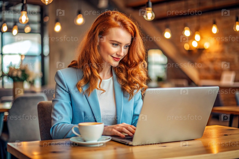 Молодая бизнес-женщина работает на ноутбуке в кафе или делает покупки онлайн