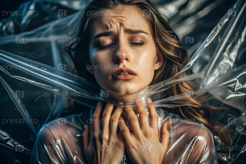 Девочка завернута в целлофан или сумку. Девушка задыхается. Пластиковое загрязнение планеты. Опасность для окружающей среды. Сокращение повторного использования пластика. Переработка. Концепция мусора
