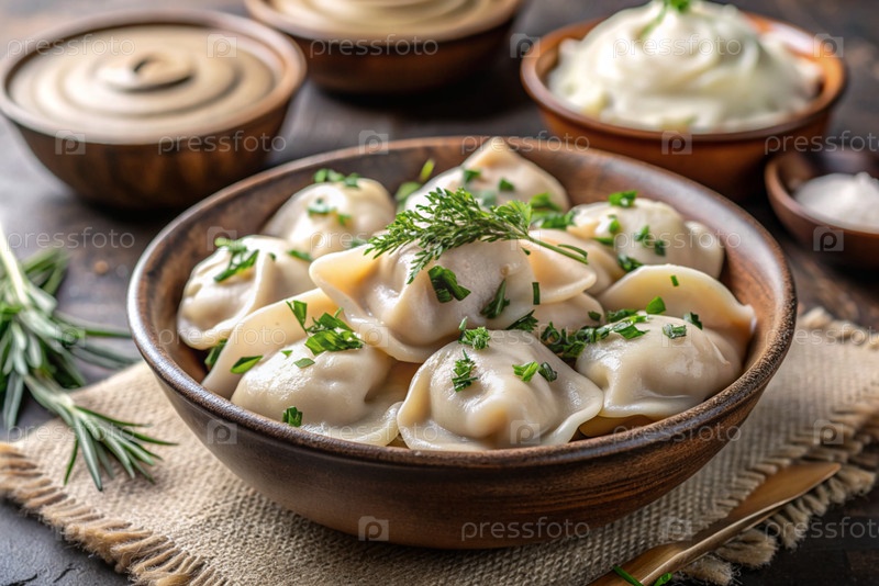 Русская кухня, пельмени в керамической миске с сметаной и травами