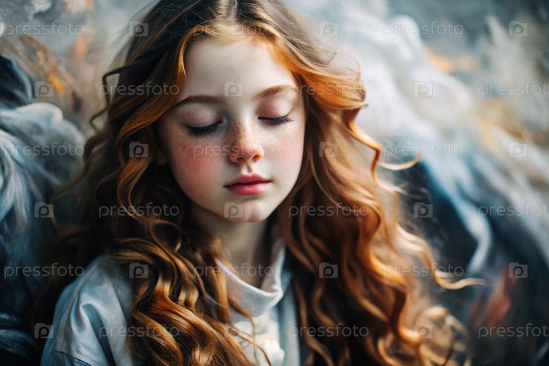 Портрет красивой маленькой рыжеволосой девочки с длинными волнистыми волосами и задумчивым взглядом.Власы развиваются и создают ощущение легкости и естественности