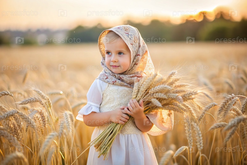 Русская девушка в белом платье и русском шале держит золотые колосья пшеницы на фоне созревающего поля. Концепция посадки и сбора богатого урожая. Сельский пейзаж