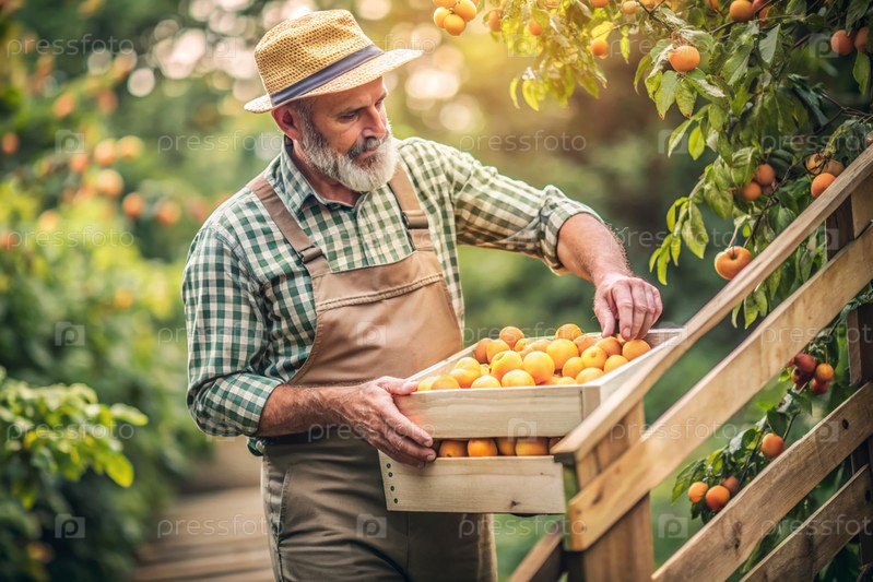 Сельскохозяйственная промышленность. Деревянный ящик с абрикосами в руках фермера-мужчины. Садовник собирает богатый урожай. Ближе, солнечный свет. Осенний урожай фруктов