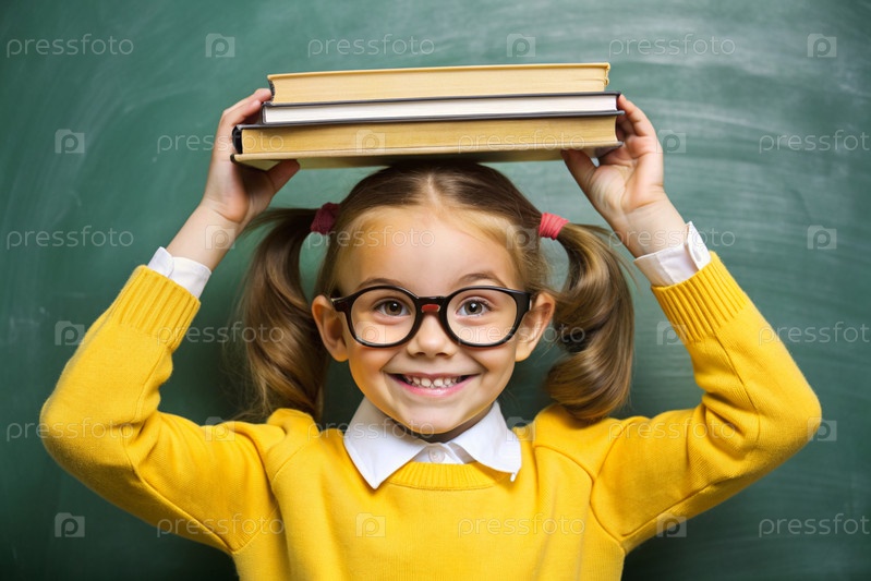 Красивая девушка с очками и книгами на голове. Ребенок впервые идет в школу. Ребёнок в классе со доской на заднем плане. Возвращение к школе
