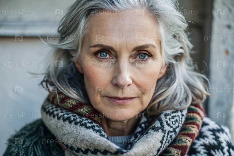 Осенний портрет красивой пожилой женщины, пенсионерки 70 лет. Она носит шарф с этническим узором и теплый свитер. Концепция жизни пожилых людей