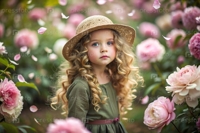 Портрет красивой маленькой кудрявой 4-летней девочки в соломенной шляпе и платье в цветущем саду пиоников. Детство. Ребенок позирует и смотрит на камеру