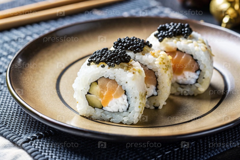 Японская еда. Суши-роллы Калифорния, Филадельфия с угорьем, красной икры и лососем. Концепция меню суши-бара