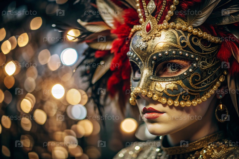 Карнавал Венеции.Закрытие женщины в украшенной карнавальной маске.Яркие цвета передают атмосферу празднования и роскоши