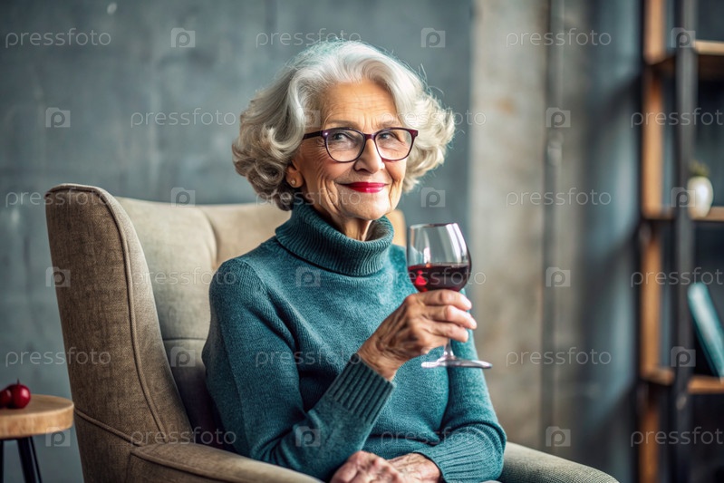 Современная, стильная пожилая женщина с короткими волосами со стаканом красного вина на стуле в гостиной дома