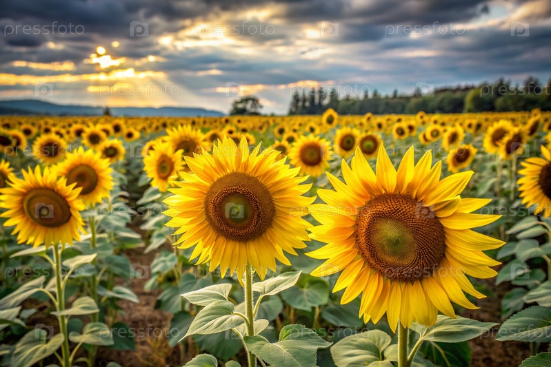 Красивое поле цветущих подсолнечников на фоне размытого золотистого заката. Коллекция семян подсолнечника, семечек подсолнечника, солнечной масла