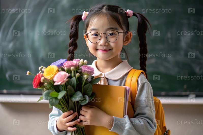 Первоклассный азиат с очками на доске. Девушка держит цветы в руках. Ребенок пойдет в школу впервые. Ребёнок с рюкзаком, книгой и цветами. Возвращение к школе
