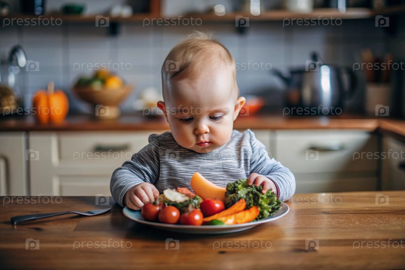 Здоровое детское питание. Первая еда. Кормить ребенка. Милый ребенок ест свежие овощи