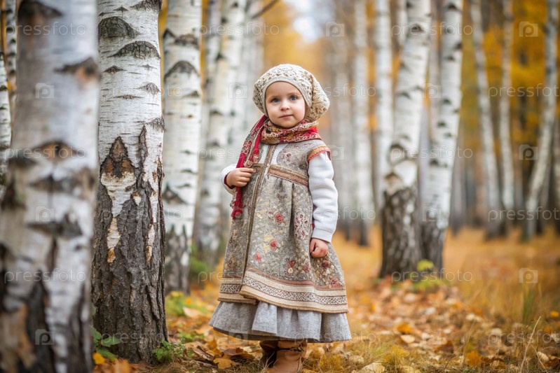 Русские народные традиции.Русский аромат.Красивая девочка в национальном русском платье и шаль в прекрасном березовом роще осенью.Портрет красивой девушки в березном лесу