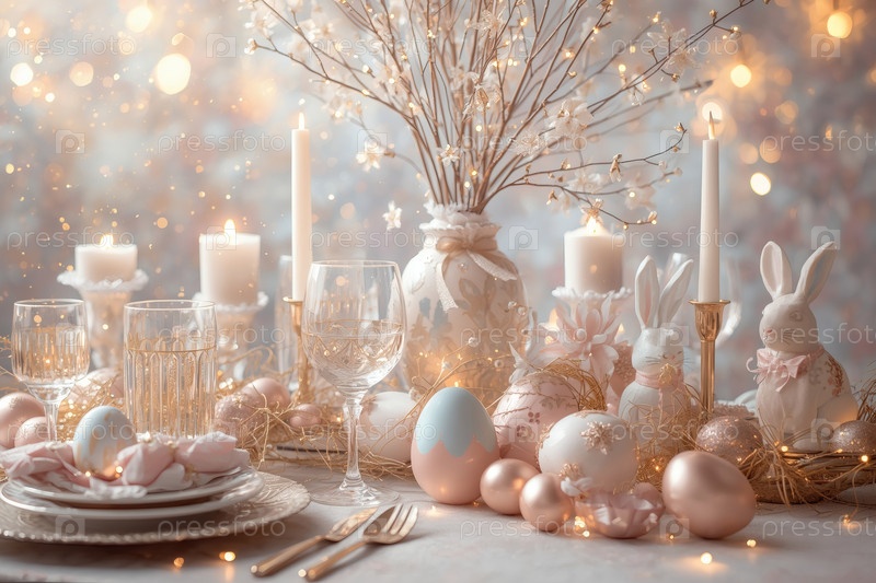 Пасхальный баннер 2026. декоративная тарелка, столовая посуда, стаканы, пасхальные яйца и кролики. концепция празднования Пасхи для кафе и ресторанов
