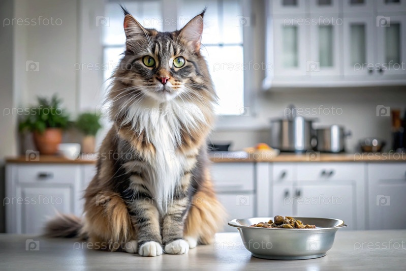 Милая кошка Майкун рядом с миской для кормления на белой кухне.Котка смотрит в камеру.Уход за животными