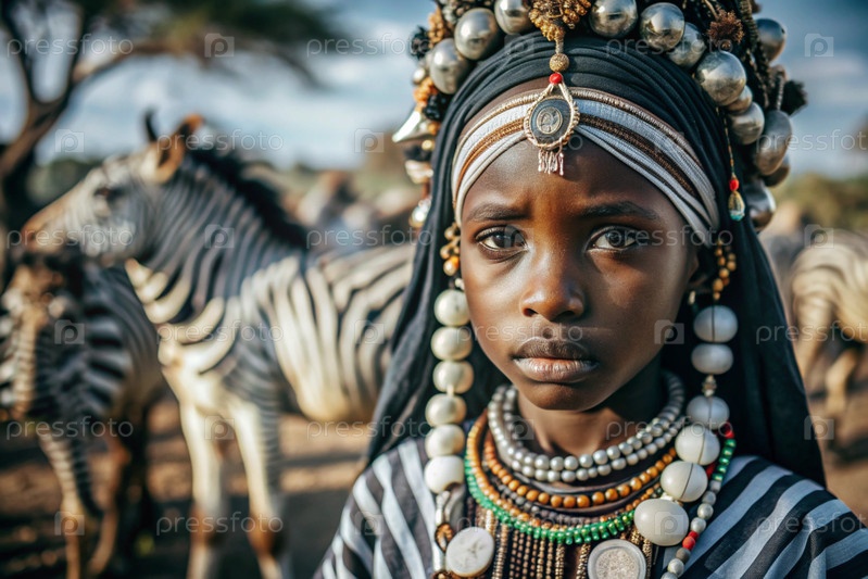 Красивая африканская девушка в традиционном национальном костюме против зебры портрет символизирует традиции и красоту африканского народа