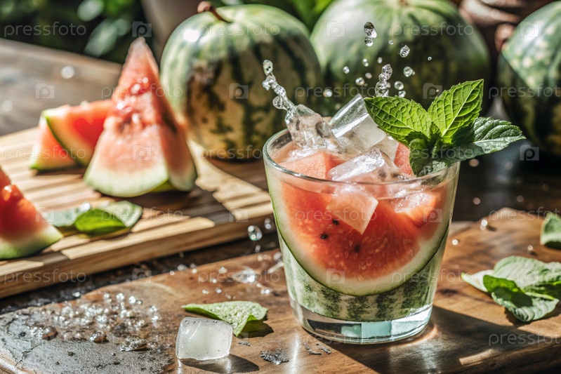 Свежий вкусный арбузный лимонад, мята, кубики льда и кусочки арбуза. летний освежающий напиток