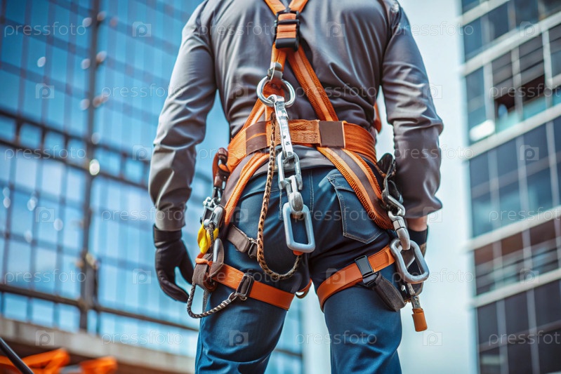 Мужчина-строитель в защитном снаряжении, ремнях безопасности и с крючками для ремней безопасности для работы на большой высоте