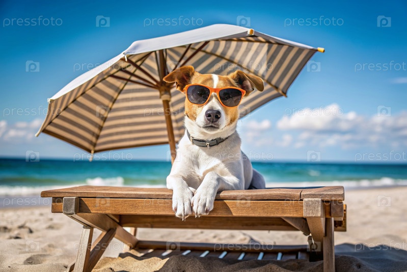 Счастливая собака на пляже в солнцезащитных очках лежит на деревянном шезлонге. концепция курортного отдыха с домашними животными