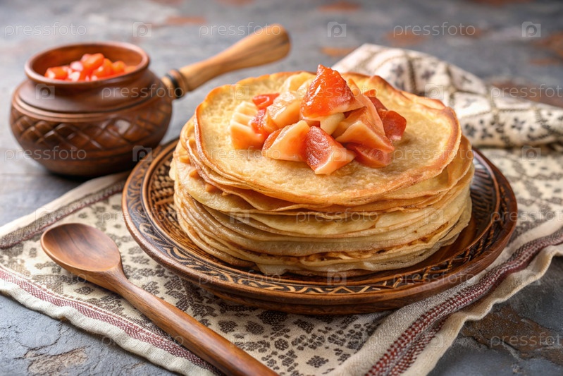 Вкусные блины с соленой красной рыбой.Концепция российского праздника Масленицы