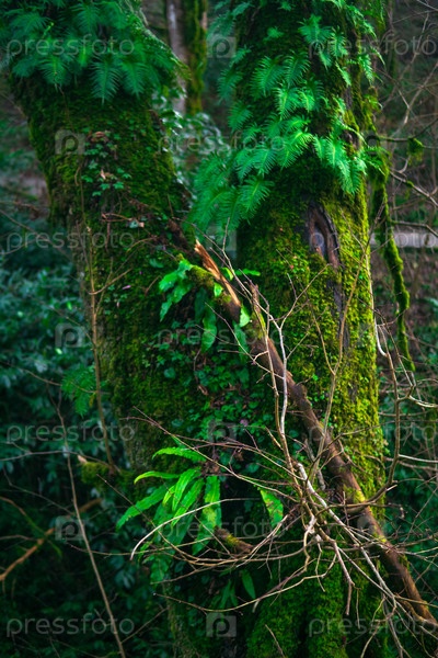 Зеленый мох и плющ на дереве в тропическом лесу