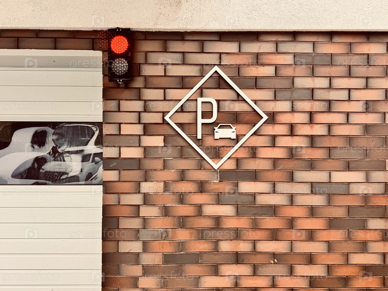 Знак парковки на фасаде современного многоквартирного дома у кирпичной стены