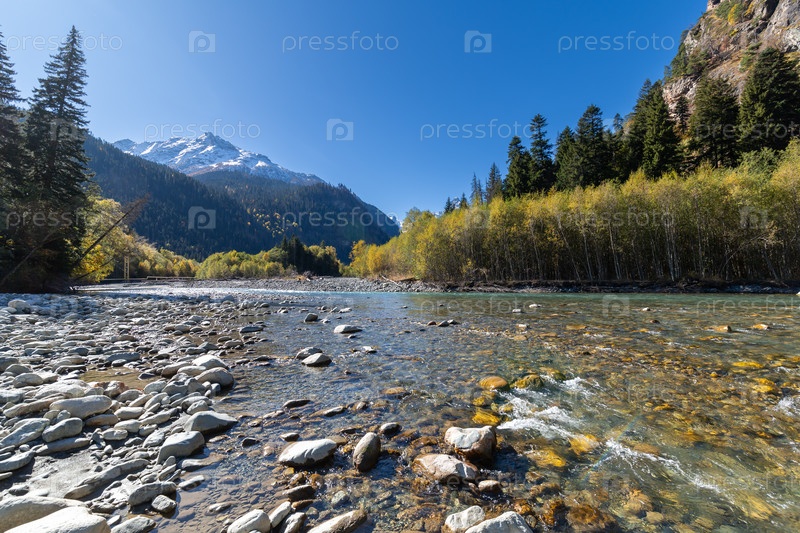 Вид на бирюзовую реку и заснеженный горный массив в заповеднике Теберда, Домбай, Северный Кавказ. Красивый осенний пейзаж в солнечный день. Исследования путешествий и дикой природы