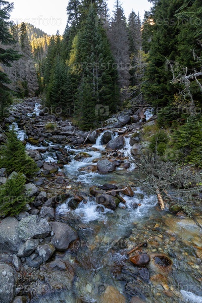 Вид на скалистую горную реку, протекающую по каменистому склону, покрытому сосновым лесом.Природный заповедник Теберда в Домбае, Северный Кавказ.Путешествие в пустыню