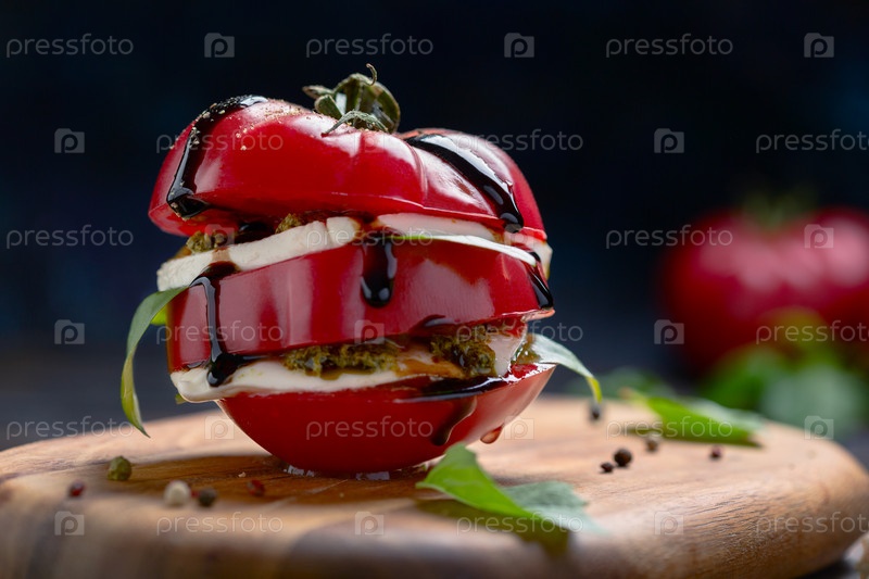 Вырежьте большой спелый помидор, моцареллу и базилик и сложите их
